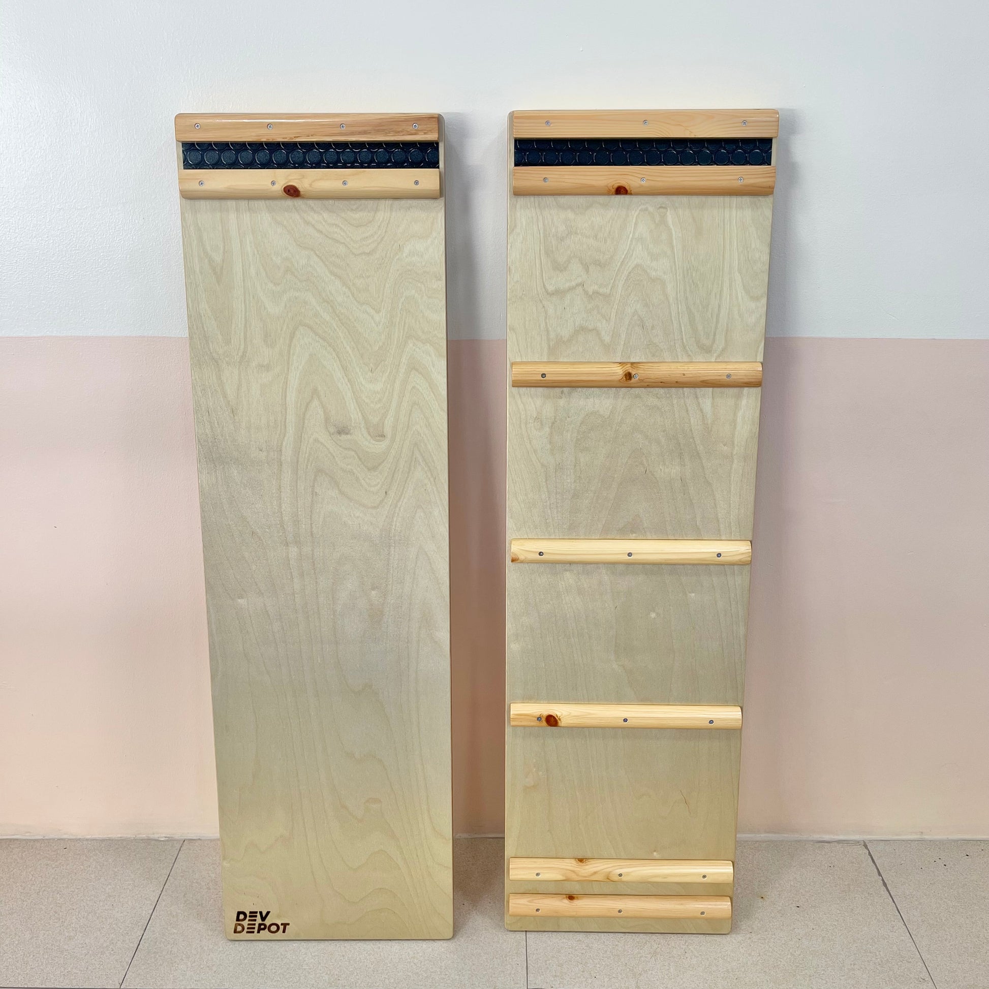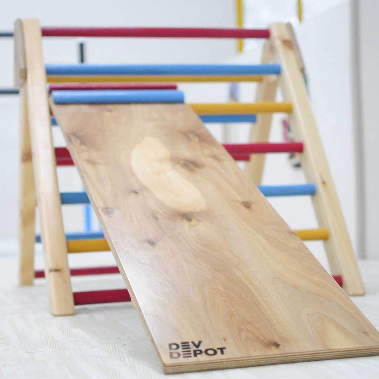 Our classic reversible ramp features a flat sliding surface on one side and half-rungs resembling a ladder on the other. We recommend positioning it at the Pikler triangle's lowest bar when introducing to babies and toddlers, and gradually moving up as they get used to it.