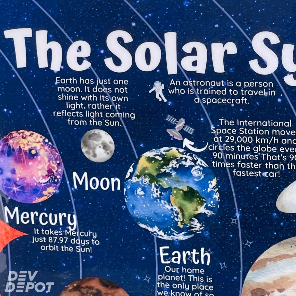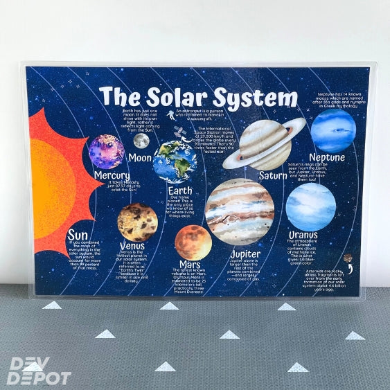 This solar system educational poster is perfect for your budding astronomer or science enthusiast! It features detailed illustrations of the planets and other objects in our solar system, including the sun, moon, asteroids, an astronaut, and the International Space Station. The planets are sized accordingly (from smallest to biggest), so that kids can easily visualize how vast our universe truly is. Snippets of information are provided as conversation starters (So get ready for allll the questions!)