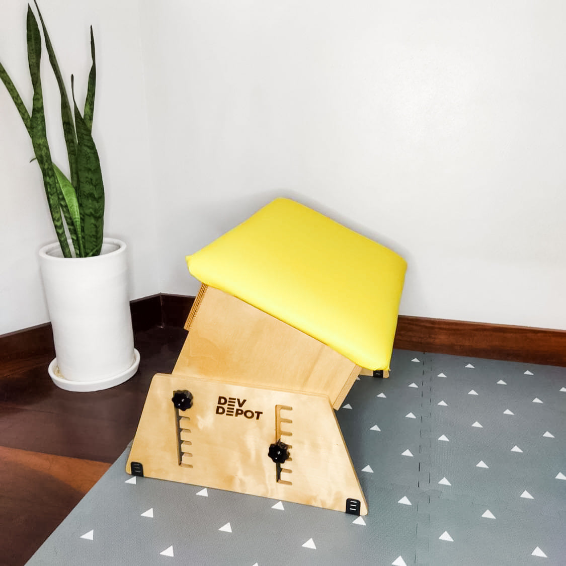 Our therapy benches provide a stable sitting surface for the child, with feet flat on the floor. This position enables them to have maximum hand and arm movements while doing therapy activities. The bench height and tilt angle can be easily adjusted without the need for any tools, allowing therapists to adjust on the fly.